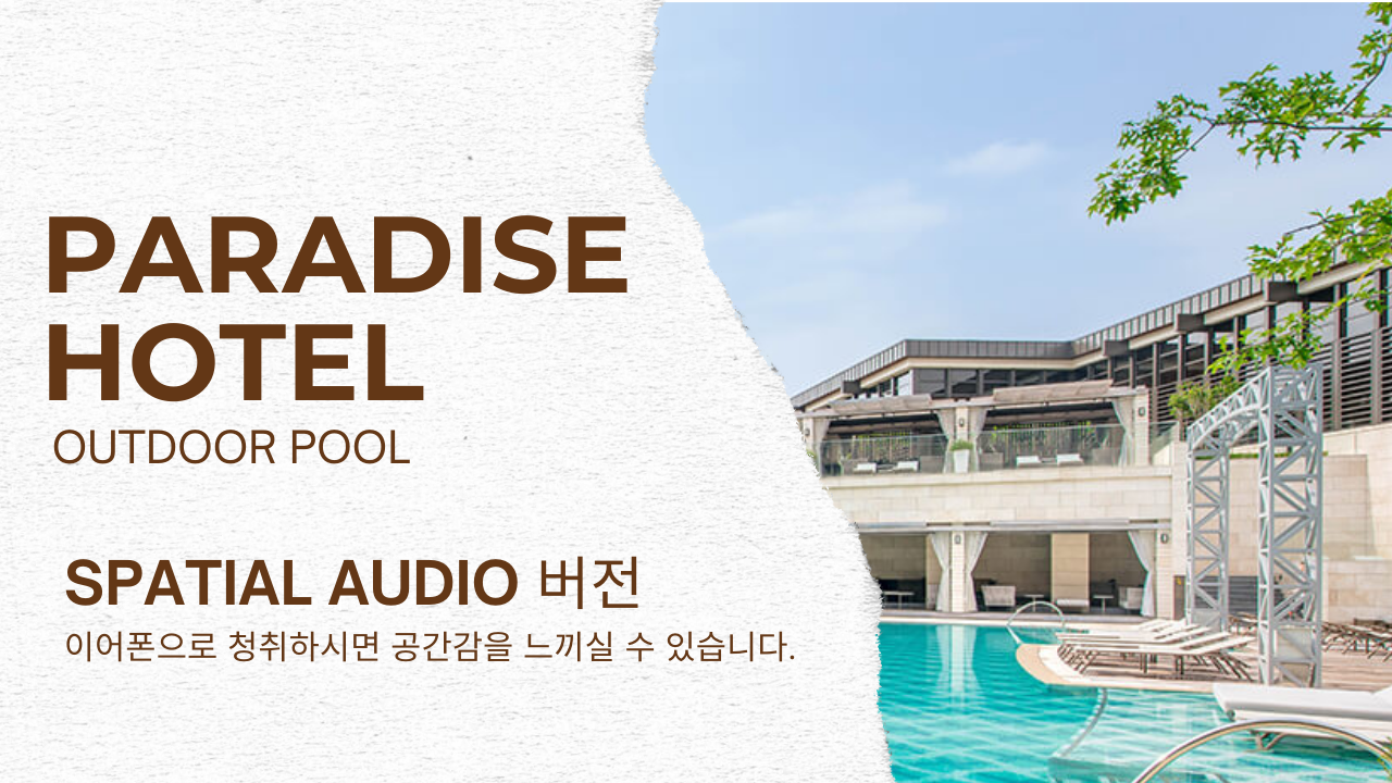 공감감 오디오로 제작한 인천 파라다이스 시티 호텔의 야외 수영장 분수 소리입니다. 이어폰으로 청취하시면 모든 방향에서 소리가 들리는 깊은 공간감을 체혐하실 수 있습니.This is the sound of the outdoor swimming pool fountain at Incheon Paradise City Hotel, produced in binaural audio. When you listen with earphones, you can experience a deep sense of immersion with sound coming from all directions. HTML 삽입 미리보기할 수 없는 소스
