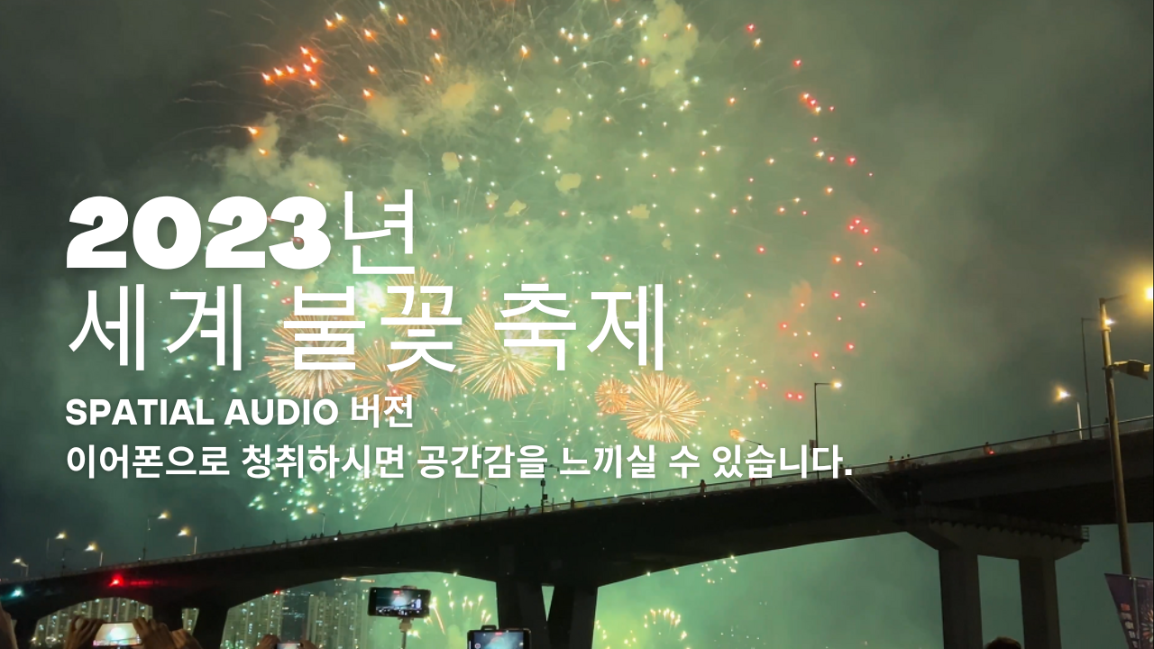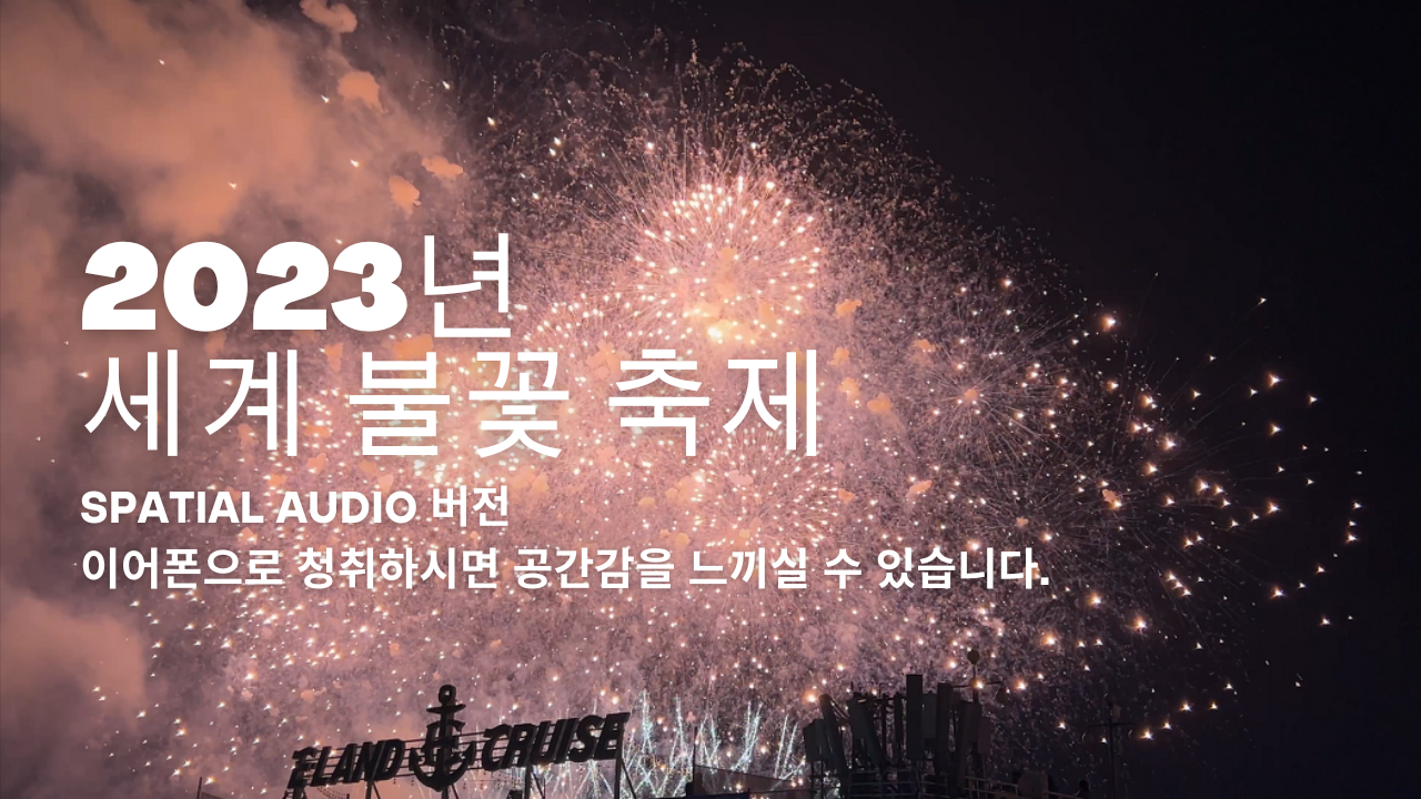 공감감 오디오로 제작한 여의도 2023년 세계 불꽃 축제 입니다. 이어폰으로 청취하시면 모든 방향에서 소리가 들리는 깊은 공간감을 체혐하실 수 있습니다. This is the 2023 Yeouido World Fireworks Festival produced in binaural audio. When you listen with earphones, you can experience a deep sense of immersion with sound coming from all directions. HTML 삽입 미리보기할 수 없는 소스